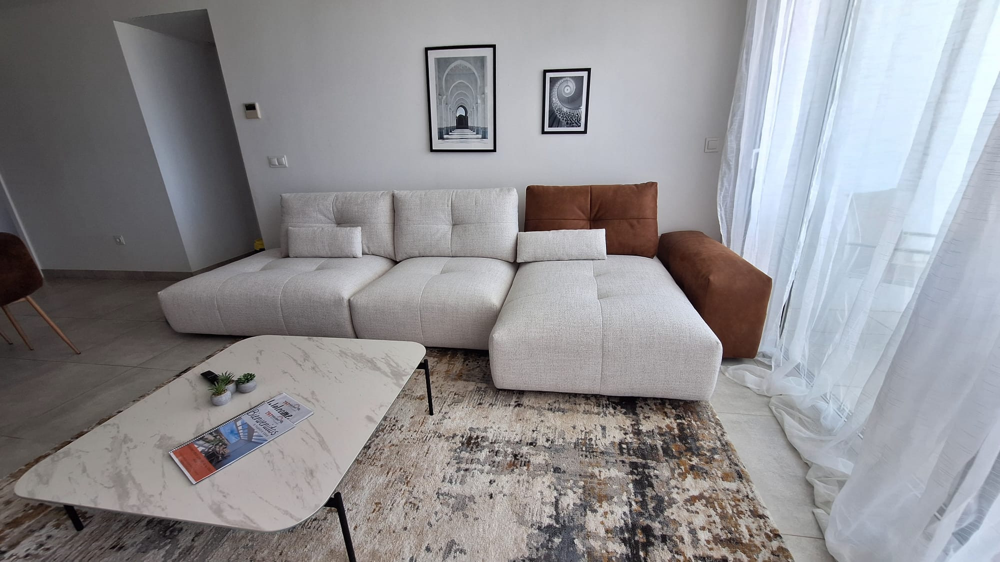 El apartamento es completamente nuevo, cuenta con una cocina totalmente equipada abierta a un salon-comedor muy luminoso con acceso directo a una amplia terraza con vistas a la montaña, el golf y el mar.