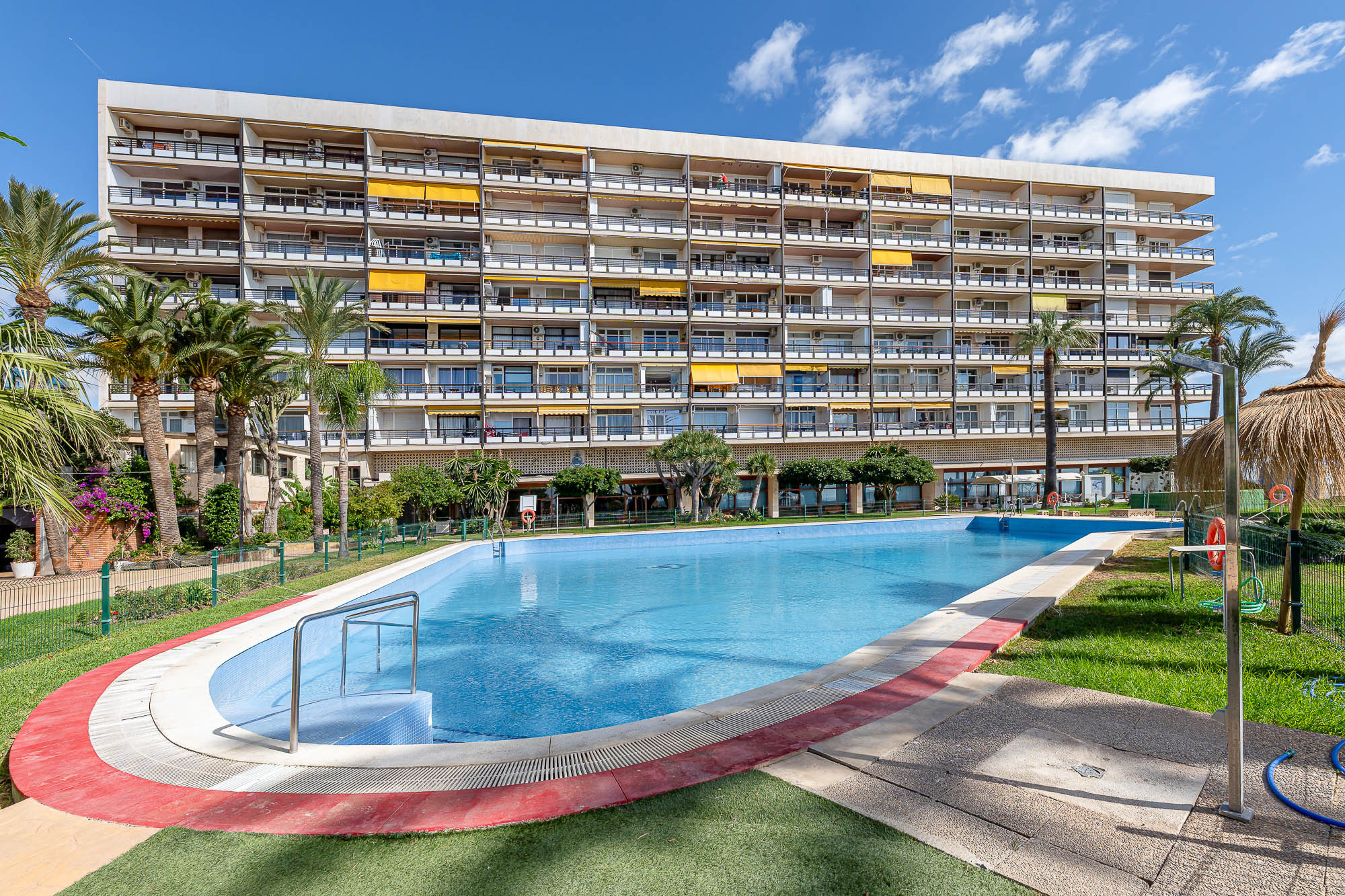 Espectacular Piscina comunitaria con vistas al mar y ascensor privado para bajar a la playa.
