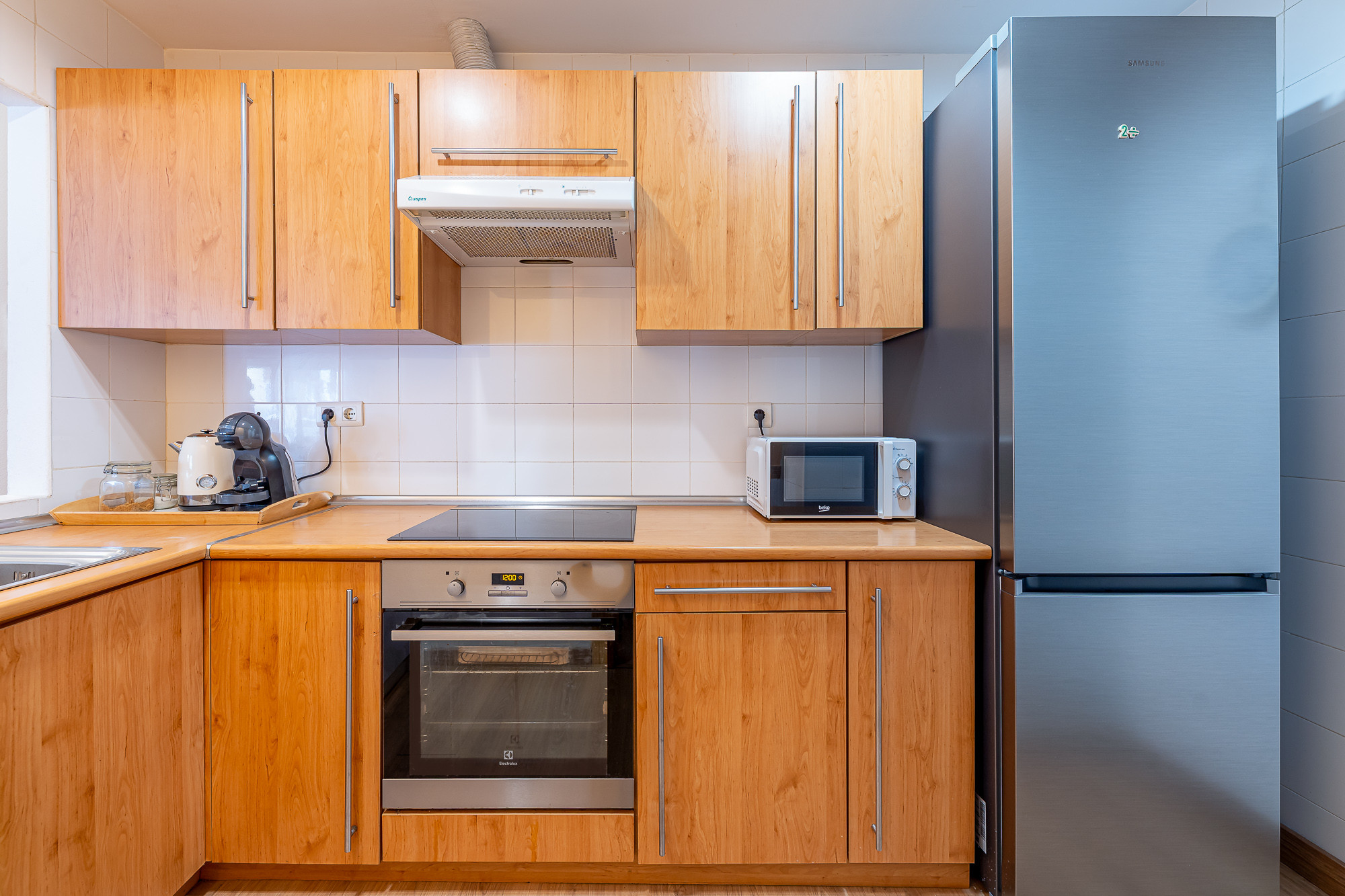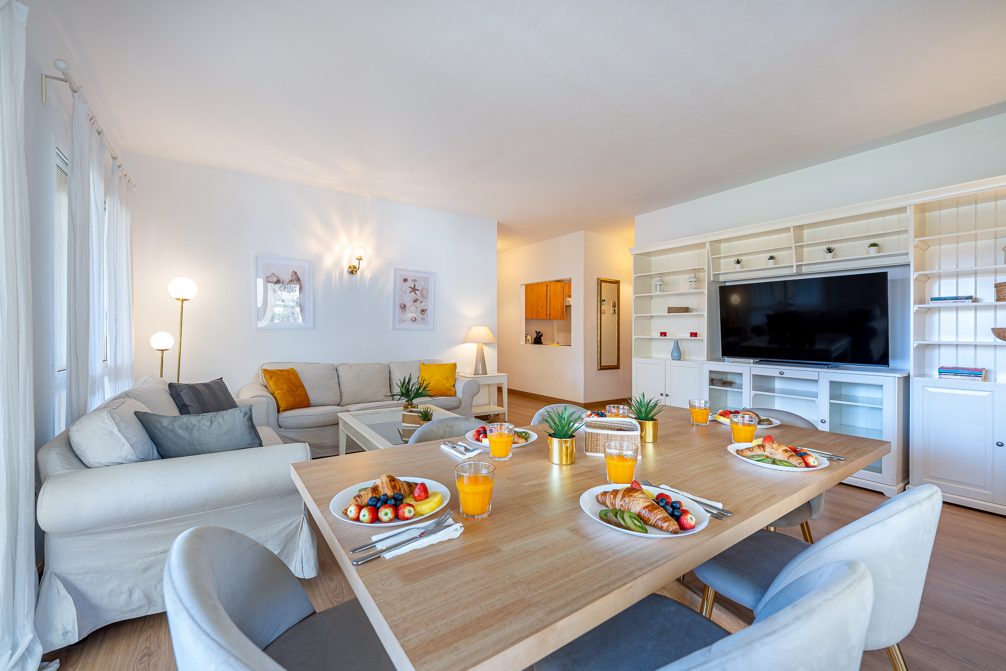 It has three rooms with a double bed, a bathroom with a shower and a year with a bathtub. A spacious living-dining room with a sofa, and a fully equipped kitchen with all appliances.