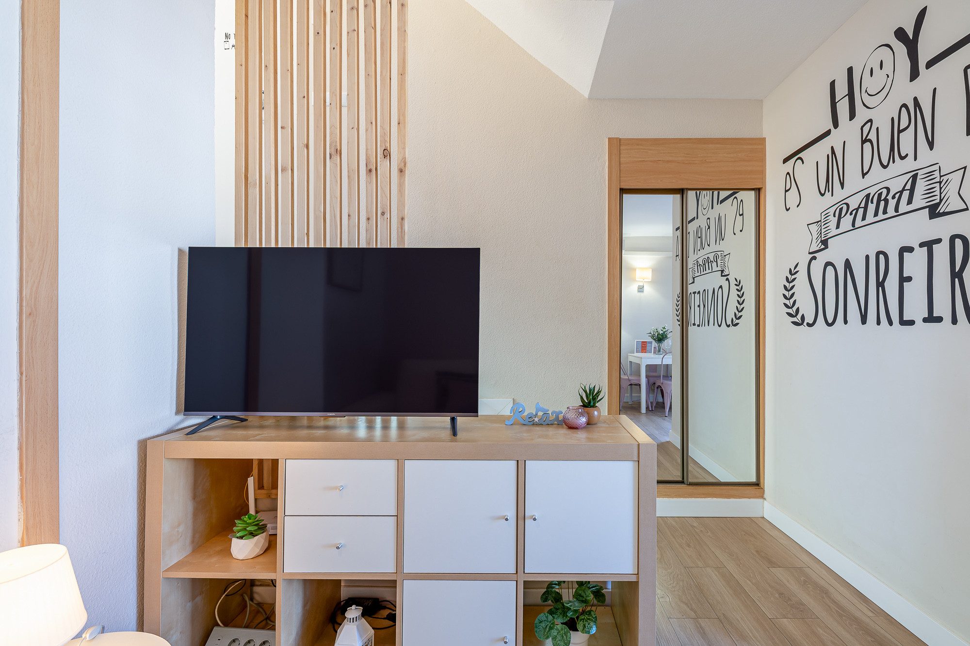 Bright living-dining room with relaxation area, TV and air conditioning.