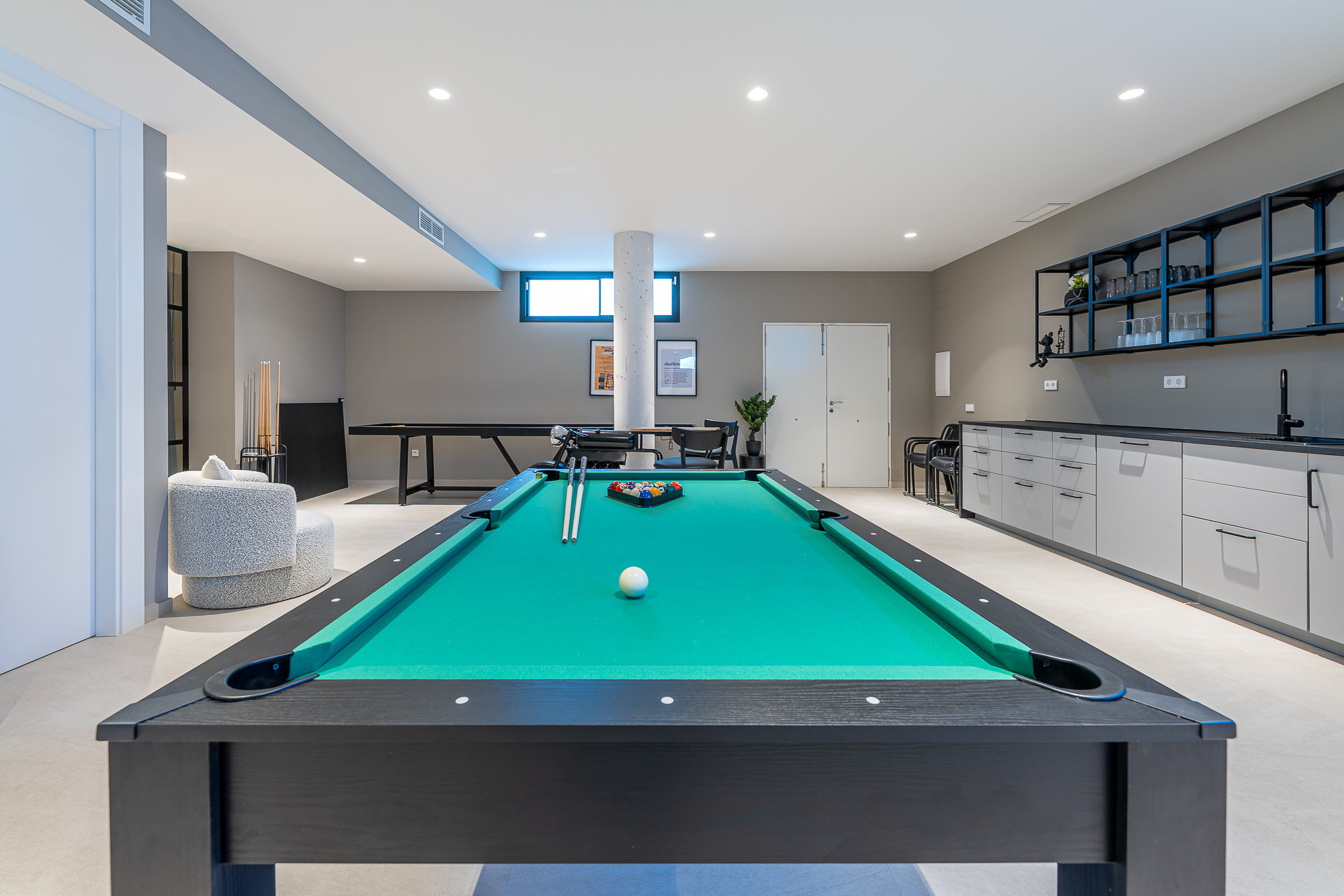 A game room with a billiard table, bar, 98-inch TV, a small fridge and dishwasher, two rooms with double beds and private bathrooms with shower. They also have a washer-dryer area for guest use.