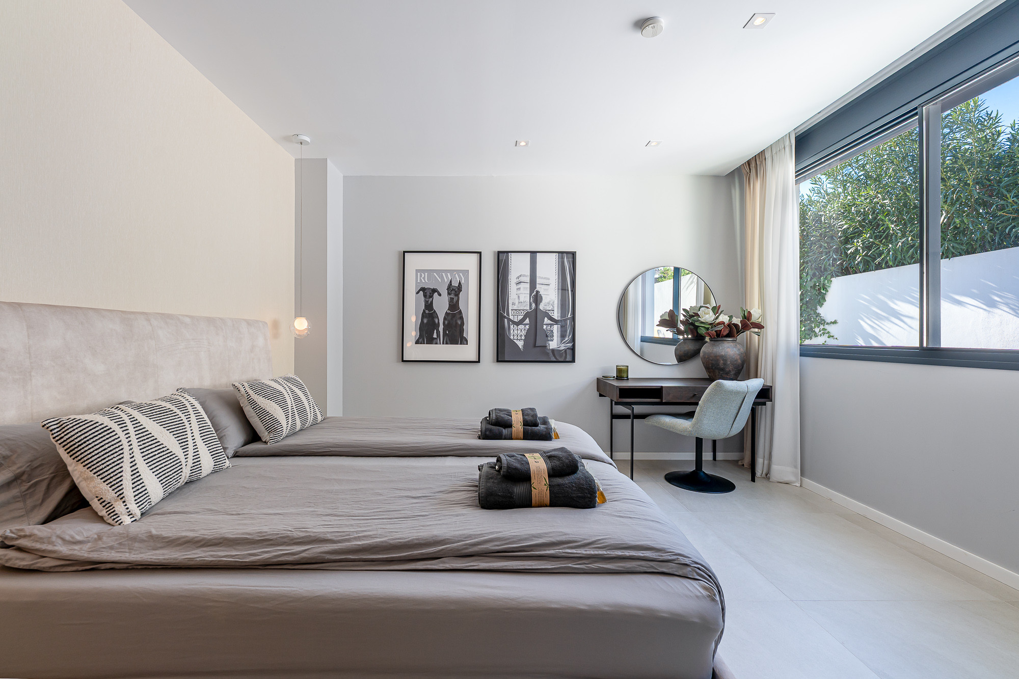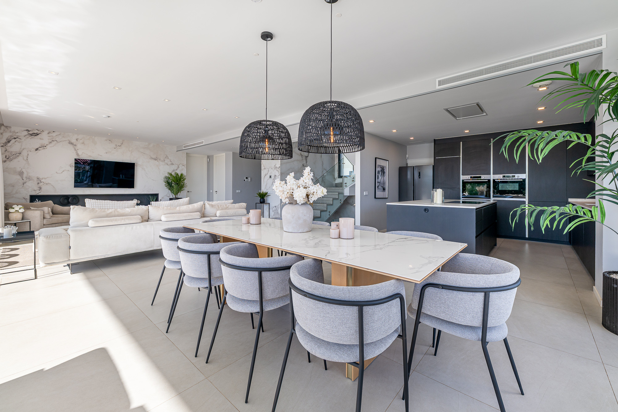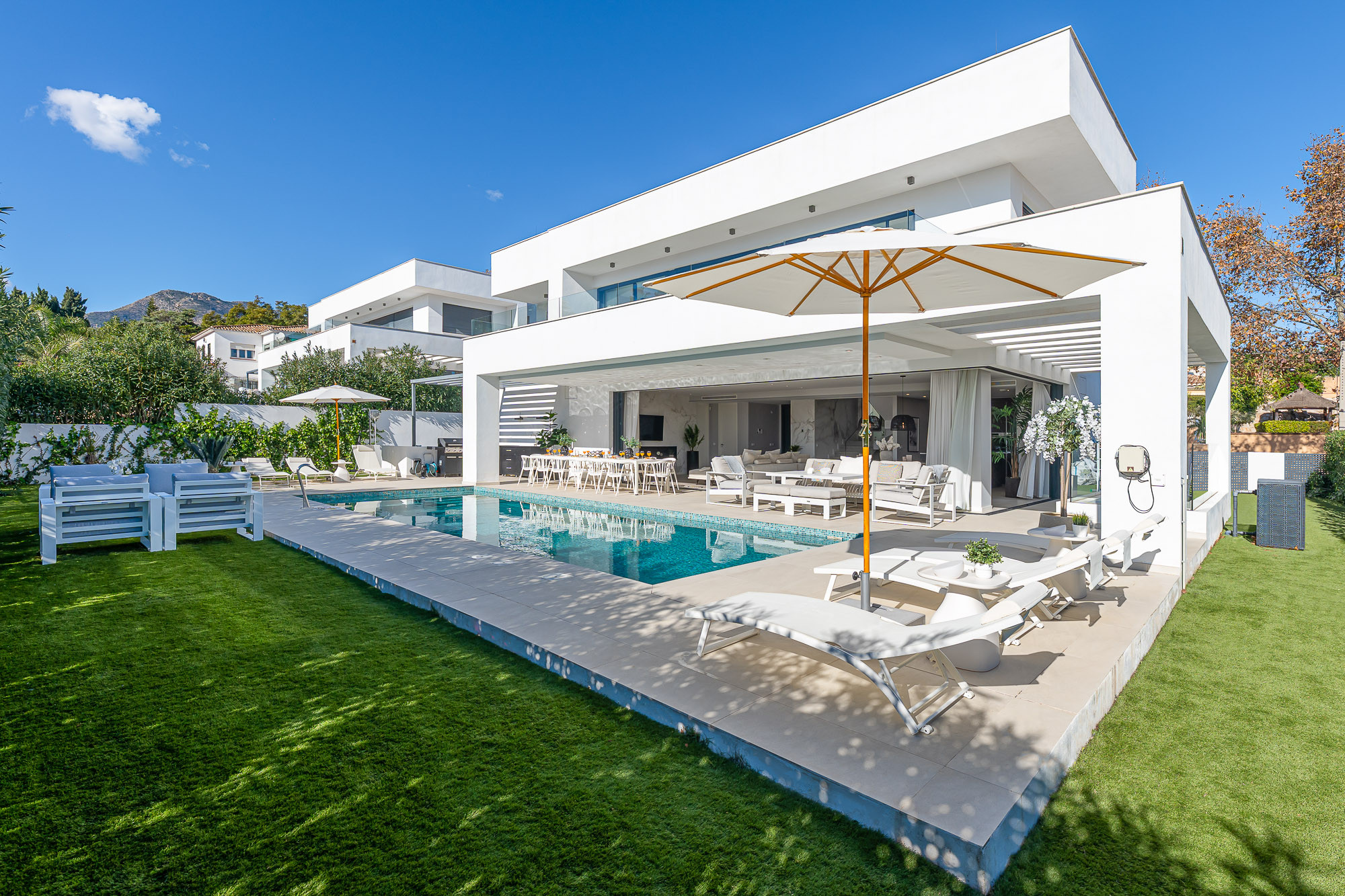 This modern villa is built on a plot of 785 m2, its location is unbeatable as it is just a few minutes walking from the beach, supermarket, restaurants and Marina Port.